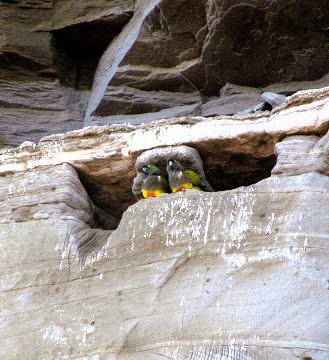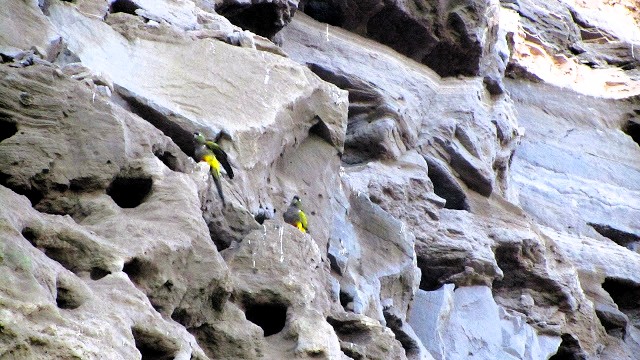 Localizada a cerca de 3 km da Vila El Cóndor, a Colonia de Loros Barranqueros abriga o maior refúgio natural dessa espécie no mundo, estendendo-se por aproximadamente 12 km ao longo das falésias de arenito do litoral. Essas aves, parentes próximas dos papagaios brasileiros, escavam os seus próprios ninhos com o bico nas paredes rochosas, formando milhares de pequenas cavidades onde colocam os ovos e cuidam dos filhotes. Estudos indicam que mais de 180 mil aves vivem na região, transformando o local em um dos cenários naturais mais impressionantes da Patagônia Argentina. No século XIX, o naturalista britânico Charles Darwin já descrevia em seu diário de viagem as aves coloridas e barulhentas que habitavam pequenas cavernas ao longo desse litoral.
